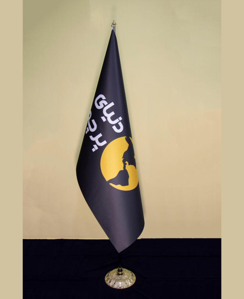 پرچم تشریفات لمینت لیزری – چاپ اختصاصی با پایه افتابگردون طلایی